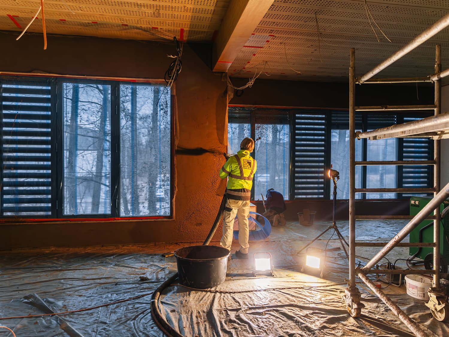 Dans les deux étages de la bâtisse, des murs simples ont été réalisés, ainsi que des murs chauffants. Au total, 47 tonnes d’argile ont été nécessaires, soit environ 3.000 bacs. Les cloisons, quant à elles, sont composées de bois provenant des forêts environnantes, afin de privilégier à nouveau le circuit court et utiliser les ressources locales, des valeurs essentielles chez Kuhn Construction. Une initiative innovante et exemplaire pour les générations futures.