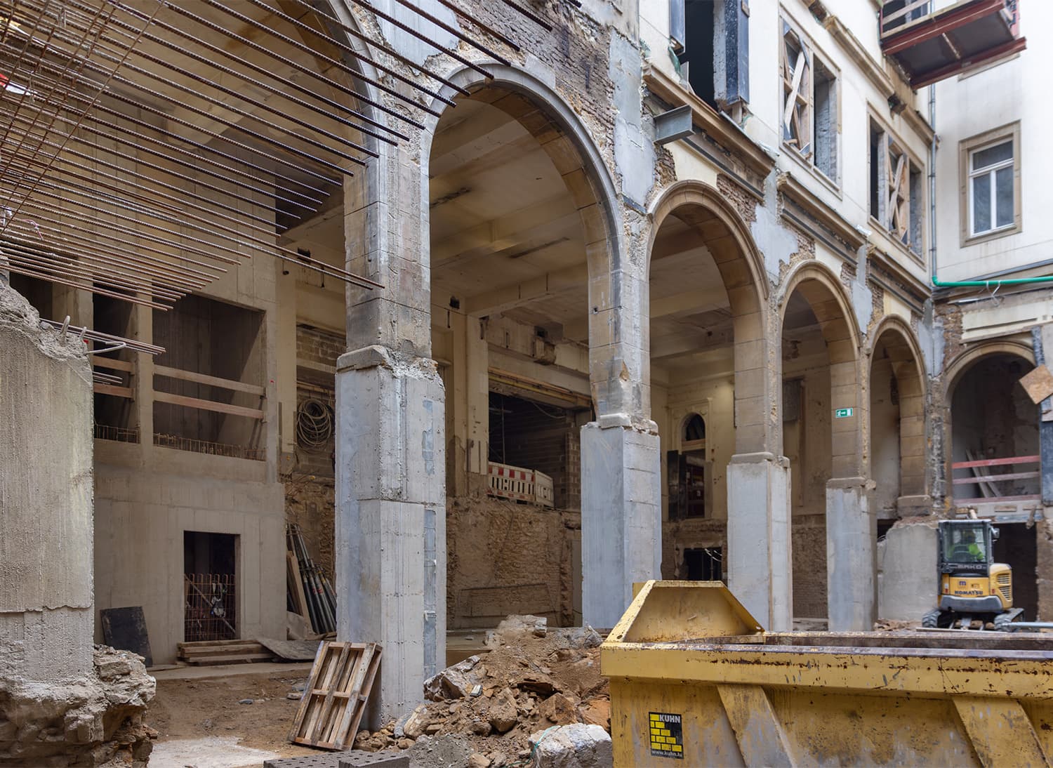 L’enjeu majeur de ce projet réside dans la transformation de la structure du bâtiment afin de l’adapter à sa nouvelle utilisation tout en assurant sa stabilité. Les lois de la gravité ont notamment été défiées durant le remplacement des piliers d’antan, d’une hauteur de 10 mètres, au niveau de la cour intérieure. « Pour les changer, nous avons mis en place un système d’étançonnage sur toute la longueur de la façade et jusqu’au deuxième étage afin de soutenir la bâtisse, explique Joni Fernandes, conducteur de travaux. Cette étape franchie, nous pouvons dire que le plus technique est derrière nous. Le service Façades prendra ensuite le relais pour restaurer leurs arches en gardant leur aspect originel. »