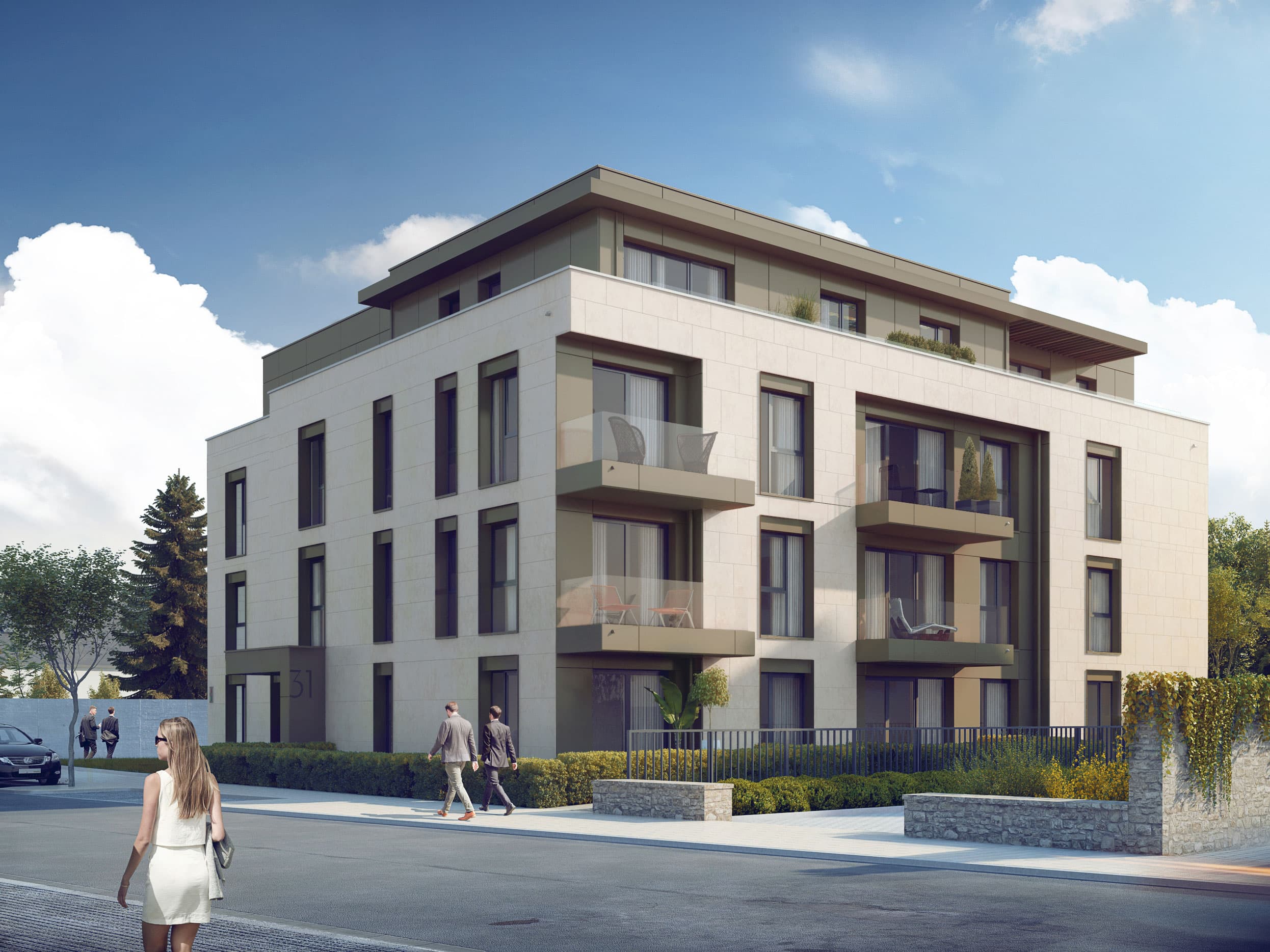 Direction Strassen, où Kuhn Construction développe et construit Domus, une élégante résidence de 14 appartements, au coeur de la rue des Romains, parallèlement à la route d'Arlon.